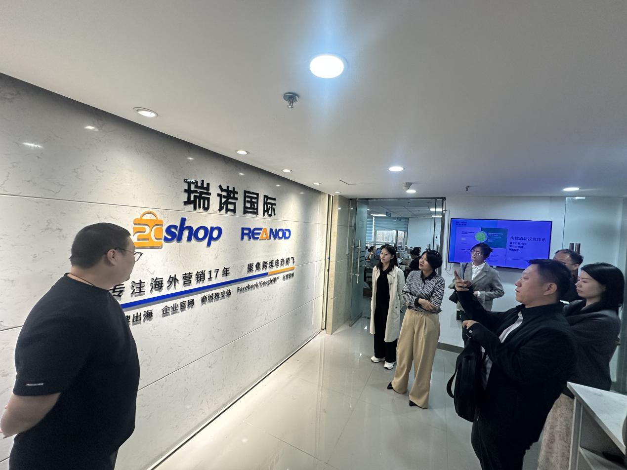 签约仪式后,王晓洁院长一行前往瑞诺国际参观交流。作为深耕跨境电商与数字服务的龙头企业,瑞诺国际介绍了自营外贸、全平台运营、企业数字服务、新顾问商学院等核心业务,展示了谷歌推广、社交媒体代运营、独立站搭建、AI技术研发与数据应用等实践成果。双方围绕跨境数字贸易研究生工作站建设、跨境电商产业学院课程共建、人才实习实训等议题深入交流,就开放实战课程、提供实践岗位、联合开展数字贸易规则研究等达成合作共识。