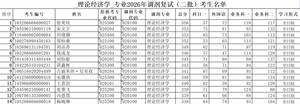 理论经济学专业2026年调剂复试(二批)考生名单